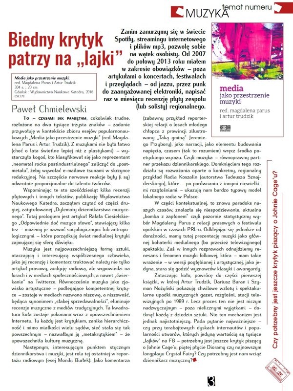 Projektor 4/2017 napisał o książce "Media jako przestrzenie muzyki", która zawiera tekst "Dostępność muzyki a dziennikarstwo muzyczne".